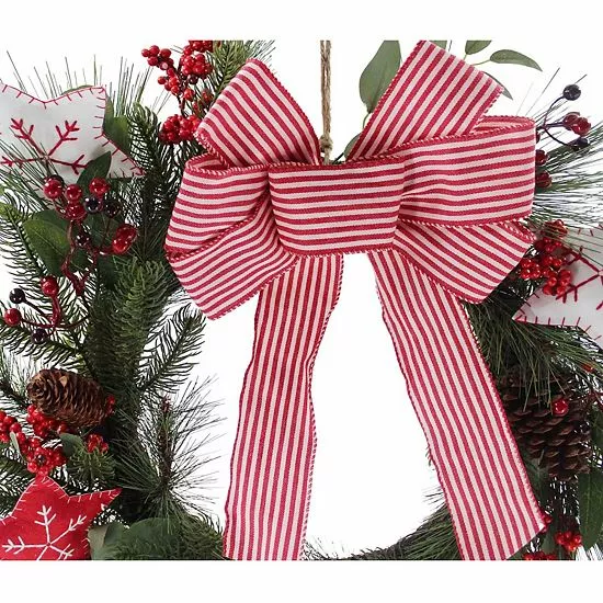 You can’t go wrong with this festive St. Nicholas Square Embroidered Stars Artificial Pine Holly Wreath.