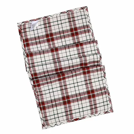 - Holly “Joy” and “Peace” accents with traditional plaid backing
